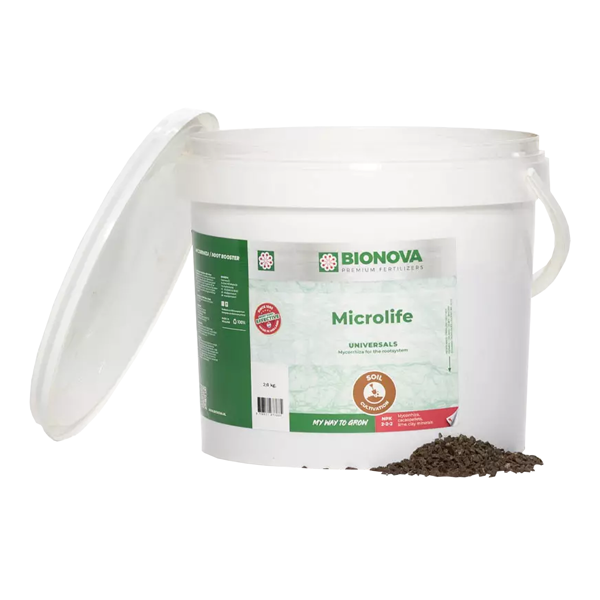 Mycorrhiza soil enhancer with micro-organisms. Microlife stimulates, enriches and adds natural occuring micro-organisms to the soil. This assures a better structure, better rooting and the air-water household will be enhanced. The uptakable fertilizers will be easier and more available, which results in a higher yield. Microlife organisms bring back the soul to your soil!