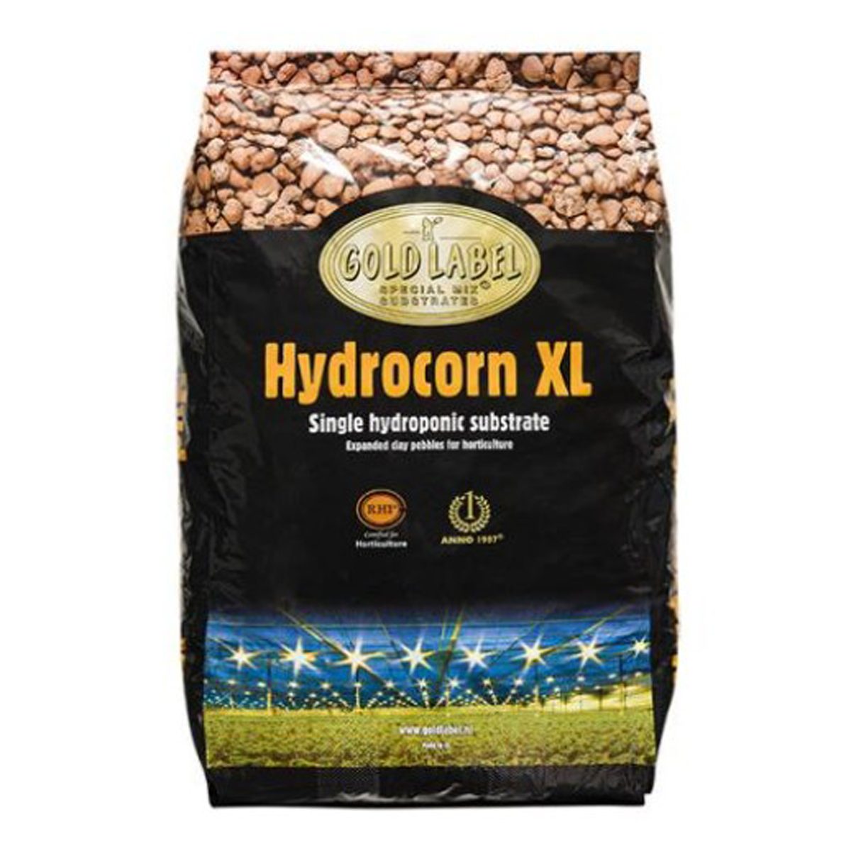 Gold Label Hydrocorn XL expanded clay pebbles are manufactured using a mix of the best quality pure clay and are baked in an open furnace using high grade clean fuels. Gold Label Hydrocorn XL proudly carries the ‘RHP certified for horticulture’ quality mark. Gold Label Hydrocorn XL is the inert hydroponic substrate of choice for professionals. The 16-25 mm size and the unique, uneven shapes of the pebbles provides better stability than even shaped round pebbles. The porous structure has a high water capacity and is suitable for both ebb/flood and top irrigation systems. Larger size won’t slip through basket and liner holes.